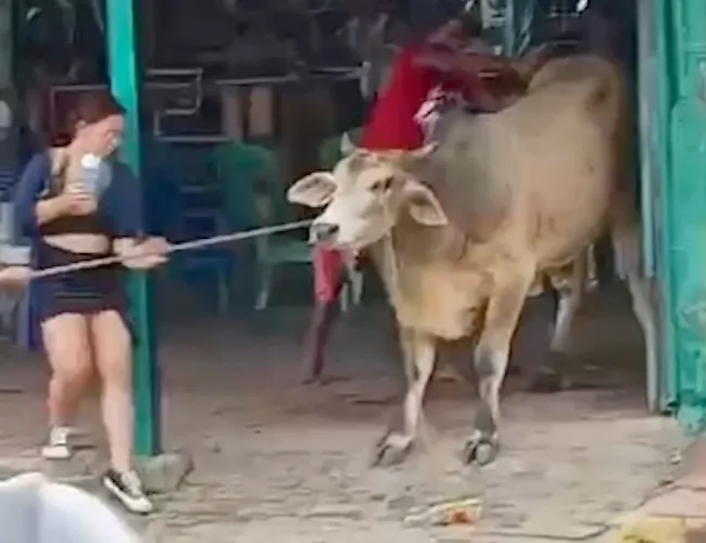 En Venezuela, se produjo un accidente en el que una mujer, distraída por su teléfono inteligente, se interpuso directamente delante de un toro embravecido mientras la gente en la calle intentaba contenerlo.