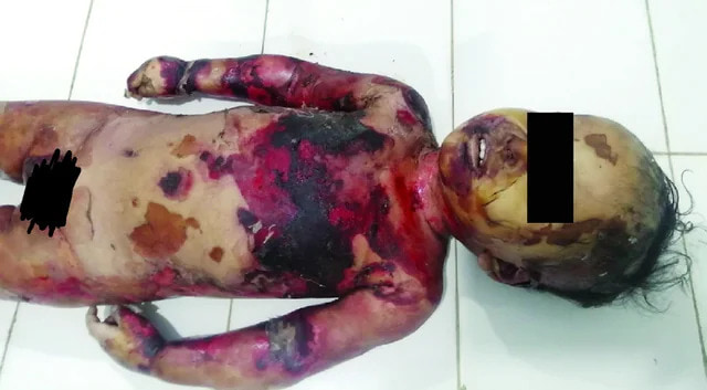 En Nepal, una niña de dos años fue dejada sin supervisión en una habitación donde había un gran caldero (utilizado para hervir estiércol de vaca para fertilizante).