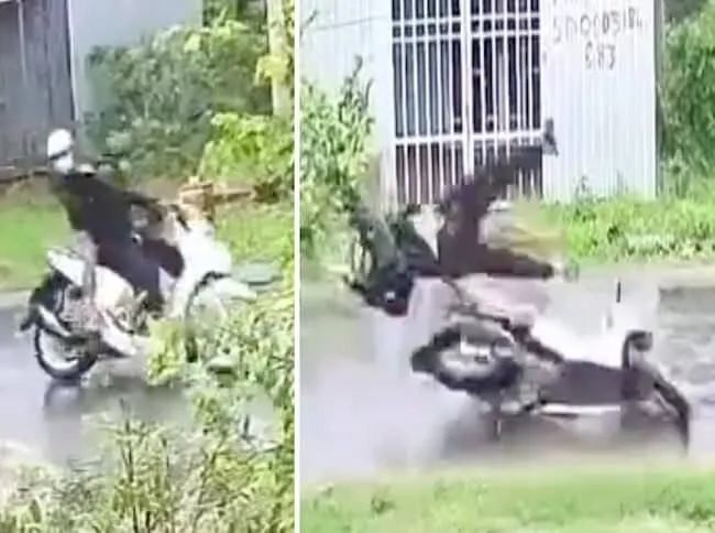 Toda la historia de un accidente en Vietnam en el que dos jóvenes que conducían una moto tocaron un cable eléctrico colgante, cayeron al vacío y se electrocutaron en el acto.