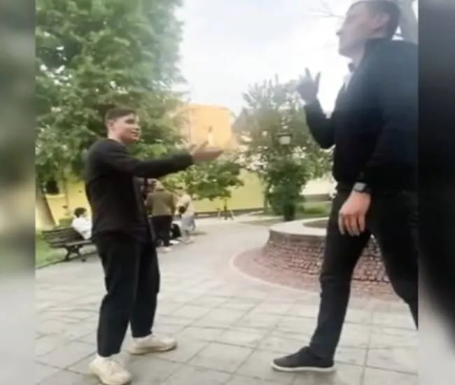 En Rusia, se desconoce si se trata de un estudiante de secundaria o universitario, pero un delincuente juvenil de baja estatura y sin sentido de la realidad provocó a un gigante de casi dos metros de altura. ⇒ El delincuente juvenil resultó así, ya que era más fuerte de lo que parecía.