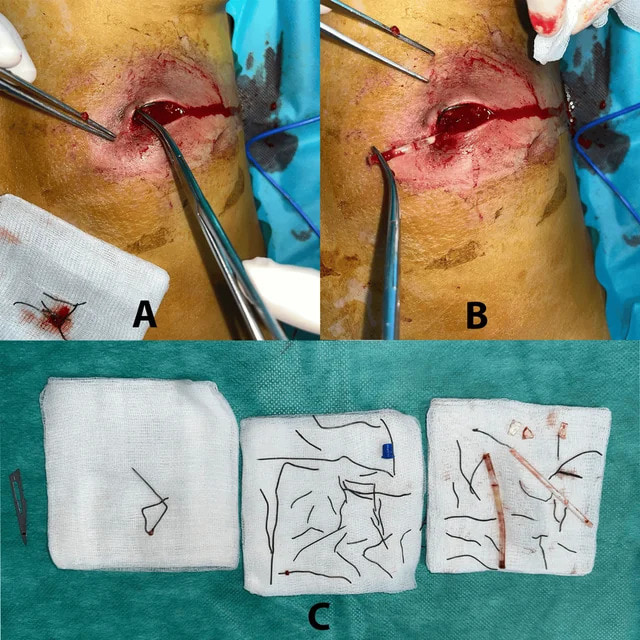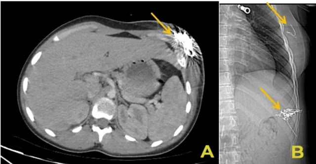 Al parecer, la niña se había introducido una gran cantidad de barras metálicas y fragmentos de cristal en el abdomen para aliviar el estrés causado por el acoso escolar. (La imagen superior procede del artículo y del vídeo relacionado).